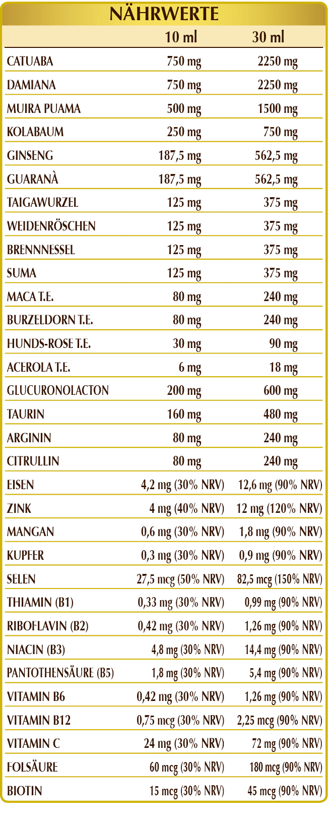 Bidestilliertes pflanzliches Glycerin, reines Wasser, Catuaba (Anemopaegma mirandum) Rinde F.G.E., Damiana (Turnera diffusa) Blätter F.G.E., Muira Puama (Ptychopetalum olacoides) Holz F.G.E., Kolabaum (Cola nitida) Samen F.G.E., Glucuronolacton, Ginseng (Panax ginseng) Wurzeln F.G.E., Guaraná (Paullinia cupana) grüne Bohnen (ungeröstet) F.G.E., Taurin, Taigawurzel oder Sibirischer Ginseng (Eleutherococcus senticosus) Wurzeln F.G.E., Epilobium (Epilobium parviflorum) Kraut F.G.E., Brennnessel (Urtica dioica) Wurzeln F.G.E., Suma oder Brasilianischer Ginseng (Pfaffia paniculata) Wurzeln F.G.E., (L-)Arginin, (L-)Citrullin, Maca oder Peruanischer Ginseng (Lepidium meyenii) Wurzeln T.E., Erd-Burzeldorn (Tribulus terrestris) Früchte T.E. (titriert mit 90% Saponine), Hunds-Rose (Rosa canina) Früchte T.E. (titriert mit 70% Vitamin C), Eisenammoniumcitrat, Zinkgluconat, Acerola (Malpighia glabra) Früchte T.E. (titriert mit 50% Vitamin C), Mangangluconat, Vitamin B3 (Niacin), Vitamin B5 (Calciumpantothenat), Kupfersulfat, Vitamin B6 (Pyridoxinhydrochlorid), Vitamin B2 (Riboflavin), Vitamin B1 (Thiaminhydrochlorid), Natriumselenit, Folsäure, Biotin, Vitamin B12 (Cyanocobalamin).