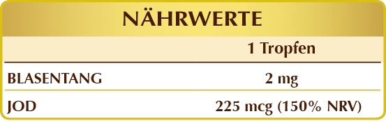 Bidestilliertes pflanzliches Glycerin, reines Wasser, Blasentang (Fucus vesiculosus) Thallus (Alge) F.G.E., Fructose, Kaliumjodid.