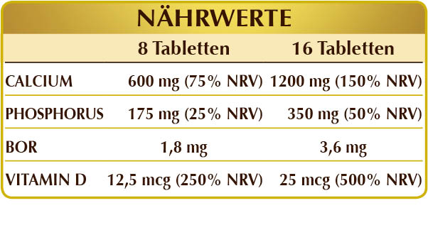 Nahrungsergänzungsmittel mit reichlich Calcium, Phosphor, Bor und Vitamin D. Vitamin D fördert die Aufnahme und Nutzung von Calcium und Phosphor, die zusammen mit ihm zur Aufrechterhaltung normaler Knochen und Zähne beitragen. Calcium kann dazu beitragen, den Verlust von Knochenmineralien bei postmenopausalen Frauen ab 50 Jahren zu reduzieren, bei denen eine niedrige Knochenmineraldichte ein Risikofaktor für osteoporotische Frakturen darstellt*. Calcium und Vitamin D tragen auch zur Aufrechterhaltung der Muskel funktion bei und sind an den Zellteilungsprozessen beteiligt. Calcium, schließlich, trägt des Weiteren zur normalen Neurotransmission und Blutgerinnung bei und erhält, zusammen mit Phosphor, den Energiestoffwechsel aufrecht.