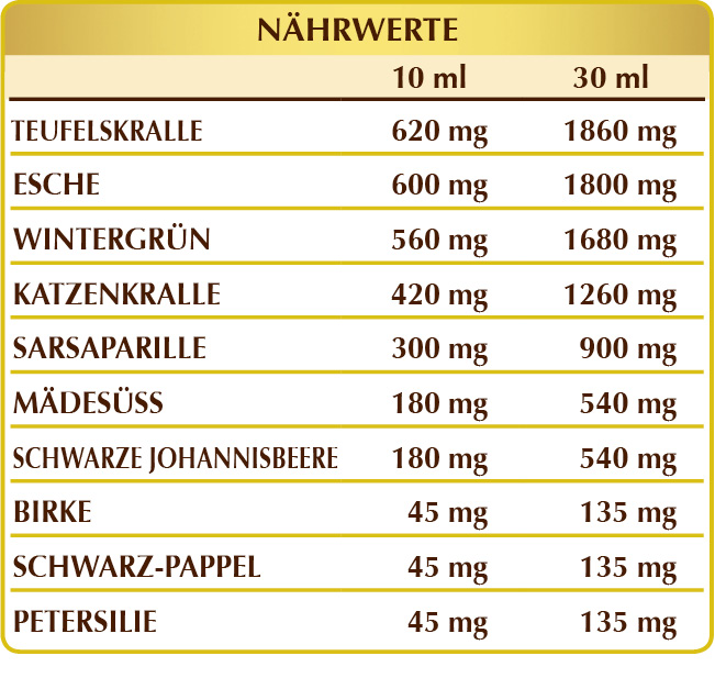 Teufelskralle, Wintergrün, Esche, Guajak, Mädesüß, Sarsaparille, Mutterkraut, Schwarze Johannisbeere, Sellerie, Schwarz-Pappel und Ingwer fördern die Gelenkfunktionalität. Esche, Guajak, Mädesüß, Petersilie, Schwarze Johannisbeere, Sellerie und Birke unterstützen die Drainage der Körperflüssigkeiten und die Funktionalität der Harnwege.