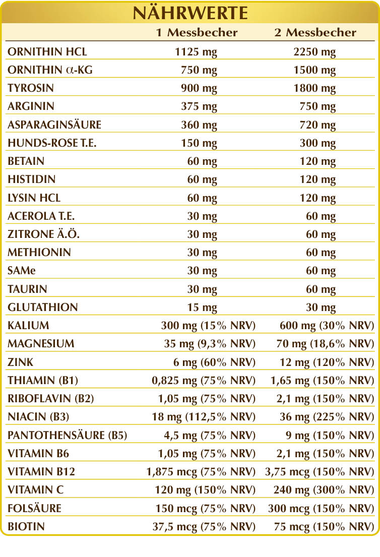 Maltodextrine aus Mais oder Reis, (L-)Ornithin, (L-)Tyrosin, Kaliumcitrat, (L-)Ornithin-α-Ketoglutarat (OKG), Dextrose, (L-)Arginin, (L-)Asparaginsäure, Magnesiumcitrat, Hunds-Rose (Rosa canina) Früchte T.E. (standardisiert auf 70 % Vitamin C), Zitrone (Citrus limonum) Früchte D.S., Kaliumgluconat, Zitronensäure; Magnesiumpidolat, Magnesiumgluconat, Betain, (L-)Lysin HCL oder Hydrochlorid, (L-)Histidin, SAMe (S-Adenosylmethionin), Zinkgluconat, Acerola (Malpighia glabra) Früchte T.E. (standardisiert auf 50 % Vitamin C), Zitrone (Citrus limonum) Fruchtschalen Ä.Ö., (L-)Methionin, Taurin, Vitamin B3 (Nicotinamid), reduziertes Glutathion, Vitamin B5 (Calciumpantothenat); natürliche Süßstoffe: Steviolglycoside aus Stevia, Thaumatin; aktiviertes Vitamin B2 (Natrium-Riboflavin-5-phosphat), aktiviertes Vitamin B6 (Pyridoxal-5-phosphat), Vitamin B1 (Thiaminhydrochlorid), aktivierte Folsäure (Calcium-L-methylfolat), Biotin, aktiviertes Vitamin B12 (5-Desoxyadenosylcobalamin, Methicobalamin).