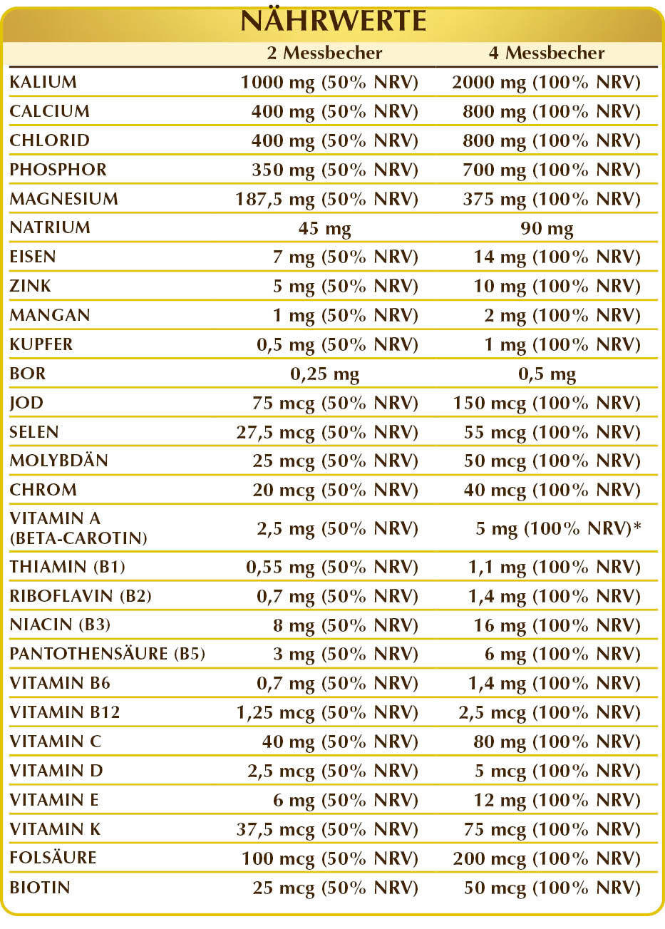 Maltodextrine aus Mais oder Reis, Kalziumglycerophosphat, Kaliumcitrat, Magnesiumcitrat, Zitrone (Citrus limonum) Früchte D.S., Kaliumchlorid, Magnesiumglycerophosphat, Acidität Korrektor: Zitronensäure, Natriumcitrat, dibasisches Kaliumphosphat, Eisenammoniumcitrat, Zinkgluconat, Vitamin C (Ascorbinsäure), Dunaliella (Dunaliella salina) Thallus (Alge) T.E. (standardisiert auf 10 % Beta-Carotin), Vitamin E (DL-α-Tocopherylacetat); Süßstoffe natürlichen Ursprungs: Steviolglycoside aus Stevia, Thaumatin; Mangangluconat, Vitamin B3 (Nicotinamid), Kupfergluconat, Vitamin B5 (Calciumpantothenat), Natriumborat, aktiviertes Vitamin B2 (Riboflavin-5-phosphat-Natriumsalz), Vitamin D3 (Cholecalciferol 100.000 I.E./g), aktiviertes Vitamin B6 (Pyridoxal-5-phosphat), Vitamin B1 (Thiaminhydrochlorid), aktiviertes Folsäure (L-Methylfolat-Calcium), Chromchlorid, Kaliumjodid, Natriummolybdat, Natriumselenit, Vitamin K1 (Phyllochinon), Biotin, aktiviertes Vitamin B12 (5-Deoxyadenosylcobalamin, Methylcobalamin).