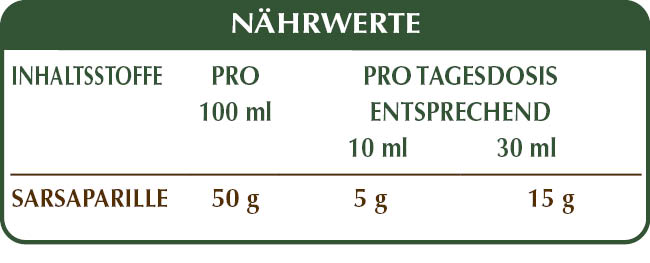 Alkoholfreie Flüssig Gesamt-Extrakt, gewonnen aus: bidestilliertes pflanzliches Glycerin, reinem Wasser, Sarsaparille (Smilax medica) Wurzeln.