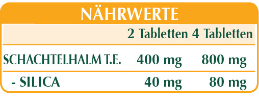 Acker-Schachtelhalm oder Pferdeschwanz (Equisetum arvense) Kraut T.E. (titriert mit 10% in Kieselerde), Maltodextrine aus Mais oder Reis, mikrokristalline Cellulose°, Gummi Arabicum°, Siliciumdioxid°°, Magnesiumstearat pflanzlichen Ursprungs°°.