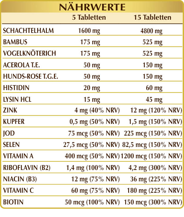 Schachtelhalm und Bambus fördern das Wohlbefinden der Nägel und der Haare. Schachtelhalm ist außerdem nützlich, um die Ernährung des Bindegewebes, die Drainage der Körperflüssigkeiten und die Funktionalität der Harnwege zu fördern. Bambus und Vogelknöterich können des Weiteren die Funktionalität des Verdauungssystems unterstützen. Angereichert mit Vitaminen und Mineralstoffen, die nützlich für das Wohlbefinden der Haare (Zink, Kupfer, Selen, Biotin) und der Haut (Zink, Kupfer, Jod, Vitamin A, Vitamin C und Biotin) sind. Insbesondere trägt Vitamin C zur Bildung von Kollagen bei, notwendig für die normale Knochen-, Knorpel-, Zahnfleisch-, Zahn- und Blutgefäßfunktion.