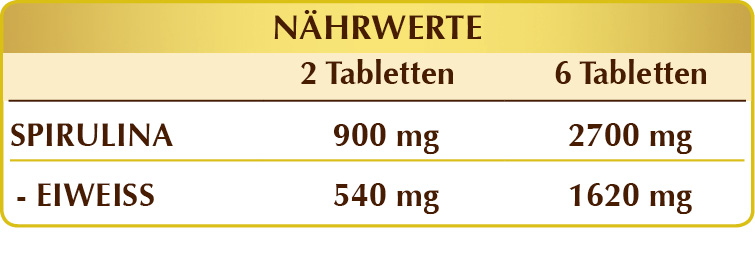 Spirulina (Spirulina maxima)) Thallus (Alge) Pulver, Maltodextrine aus Mais oder Reis, mikrokristalline Cellulose°, Gummi Arabicum°, Siliciumdioxid°°, Magnesiumstearat pflanzlichen Ursprungs°°.