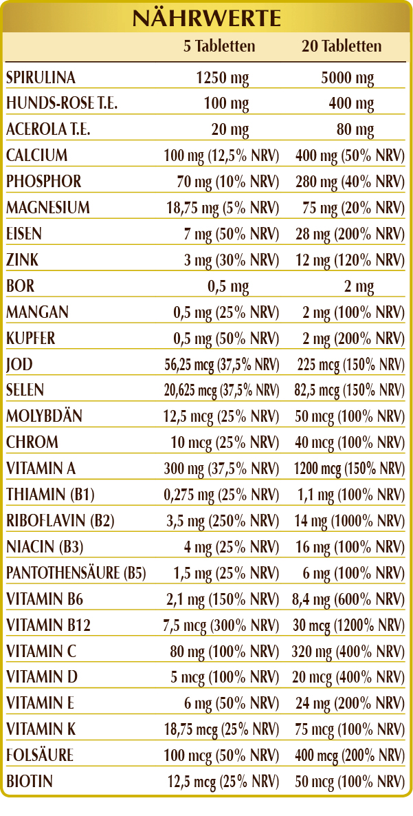 Spirulina (Spirulina maxima) einzellige Algen, dibasisches Kalziumphosphat, mikrokristalline Cellulose°, Gummi arabicum° Hunds-Rose (Rosa canina) Früchte G.T.E. (titriert mit 70% Vitamin C), Eisengluconat, Kalziumcarbonat, Magnesiumglycerophosphat, Magnesiumoxid, Siliciumdioxid°°, Zinkgluconat, Acerola (Malpighia glabra) Früchte T.E. (titriert mit 50% Vitamin C), Vitamin E natürlicher Herkunft (D-α-Tocopherylacetat), Magnesiumstearat Pflanzlichen Ursprungs°°, aktiviertes Vitamin B2 (Natrium-Riboflavin-5-phosphat), Natriumborat, Mangangluconat, Vitamin B3 (Nicotinamid), aktiviertes Vitamin B6 (Pyridoxal-5-phosphat), Vitamin A (Retinylacetat), Flechte (Cladonia rangiferina) Thallus T.E. (titriert mit Vitamin D3 Cholecalciferol 100.000 IE/g), Kupfersulfat, Vitamin B5 (Calciumpantothenat), Vitamin B1 (Thiaminhydrochlorid), aktivierte Folsäure (Calcium-L-Methylfolat), Chrompicolinat, Kaliumiodid, Natriumselenit, Natriummolybdat, Vitamin K1 (Phyllochinon), Biotin, aktiviertes Vitamin B12 (5-Deoxyadenosylcobalamin, Methylcobalamin). °Füllstoff.°°Trennmittel