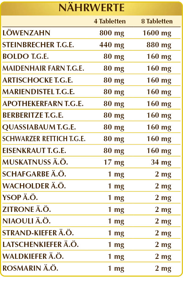 Löwenzahn (Taraxacum officinale) Blätter Pulver, mikrokristalline Cellulose°, Gummi arabicum°, Chanca Piedra oder Phyllanthus (Phyllanthus niruri) Kraut T.G.E., Boldo (Peumus boldus) Blätter T.G.E., maidenhair farn (Adiantum capillus-veneris) Kraut T.G.E., Artischocke (Cynara scolymus) Blätter T.G.E., Mariendistel (Silybum marianum) Kraut T.G.E., Apothekerfarn oder Steinbrecher (Ceterach officinarum) Blätter T.G.E., Berberitze (Berberis vulgaris) Wurzel Rinde T.G.E., Quassiabaum (Quassia amara) Holz T.G.E., Schwarzer Rettich (Raphanus sativus var. niger) Wurzeln T.G.E., Eisenkraut (Verbena officinalis) Kraut mit Blüten T.G.E., Siliziumdioxid, Magnesiumstearat pflanzlichen Ursprungs, Muskatnuss (Myristica fragrans) Früchte (Kernel) Ä.Ö., Schafgarbe (Achillea millefolium) Kraut mit Blüten Ä.Ö., Wacholder (Juniperus communis) Beerenzapfen (Früchte) Ä.Ö., Ysop (Hyssopus officinalis) Blätter Ä.Ö., Zitrone (Citrus limon) Fruchtschale Ä.Ö., Niaouli (Melaleuca viridiflora) Blätter Ä.Ö., Strand-Kiefer (Pinus pinaster) Nadeln (Blätter) Ä.Ö., Latschenkiefer (Pinus mugo, montana oder pumilio) Nadeln (Blätter) Ä.Ö., Rosmarin (Rosmarinus officinalis) Blütenspitzen Ä.Ö.