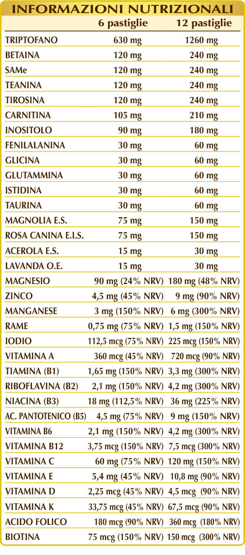 (L-)Tryptophan, mikrokristalline Cellulose°, Gummi arabicum°, SAMe (S-Adenosylmethionin-Disulfat-Tosilat), Acetyl-(L-)Carnitin-HCl oder Hydrochlorid, Magnesiumoxid, Betain, (L-)Theanin, (L-)Tyrosin, myo-Inositol pflanzlichen Ursprungs (aus Maiskernen extrahiert), Magnolie (Magnolia officinalis) Rinde T.E. (titriert mit 90% Magnolol und Honokiol), Hunds-Rose (Rosa canina) Früchte T.E. (titriert mit 70% Vitamin C), Siliciumdioxid°°, Zinkgluconat, (L-)Phenylalanin, Glycin, (L-)Glutamin, (L-)Histidin, Taurin, Mangangluconat, Lebensmittelgelatine, Vitamin B3 (Nicotinamid), Acerola (Malpighia glabra) Früchte T.E. (titriert mit 50% Vitamin C), Lavendel (Lavandula officinalis) blühende Spitzen Ä.Ö., Magnesiumstearat pflanzlichen Ursprungs°°, Vitamin E natürlicher Herkunft (D-α-Tocopherylacetat), Kupfergluconat, Vitamin B5 (Calciumpantothenat), aktiviertes Vitamin B2 (Natriumriboflavin-5-phosphat), aktiviertes Vitamin B6 (Pyridoxal-5-phosphat), Vitamin A (Retinylacetat), Vitamin B1 (Thiaminhydrochlorid), Flechte (Cladonia rangiferina) Thallus T.E. (titriert in Vitamin D3 Cholecalciferol 100.000 IE/g), aktivierte Folsäure (Calcium-L-Methylfolat), Kaliumiodid, Biotin, Vitamin K1 (Phyllochinon), aktiviertes Vitamin B12 (5-Desoxyadenosylcobalamin, Methicobalamin). °Füllstoff °°Trennmittel
