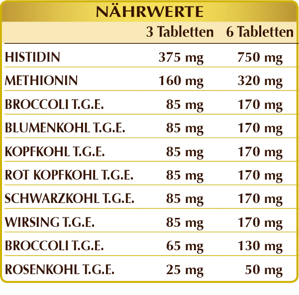 Nahrungsergänzungsmittel auf Broccoli und Kohl-Extrakt, angereichert mit Histidin und Methionin. Broccoli, Blumenkohl und alle zur Herstellung des Extrakts verwendeten Kohlarten wirken antioxidativ, fördern die regelmäßige Funktion des Herz-Kreislauf-Systems, unterstützen die Verdauungsfunktion und tragen zur Aufrechterhaltung einer normalen Gelenkfunktion bei.