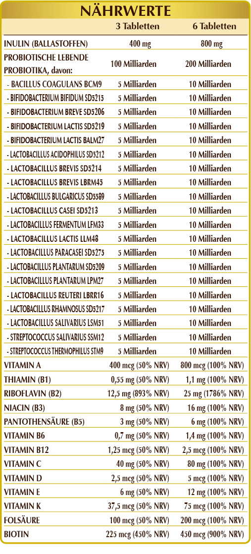 Inulin Wurzeln Reis, Milchfermente-Mischung (titriert mit 23,5 Mld/Tag in jedem der folgenden Stämme: Bacillus coagulans BCM9; Bifidobacterium lactis BALM27; Lactobacillus brevis LBRM45, fermentum LFM33, lactis LLM48, plantarum LPM27, reuteri LBRR16, salivarius LSM51, Streptococcus salivarius SSM12, thermophilus STM9), Milchfermente-Mischung (titriert mit 23,5 Mld/Tag in jedem der folgenden Stämme: Bifidobacterium bifidum SD5215, breve SD5206, lactis SD5219; Lactobacillus acidophilus SD5212, brevis SD5214, bulgaricus SD5589, casei SD5213, paracasei SD5275, plantarum SD5209, rhamnosus SD5217); Süßstoff natürlichen Ursprungs: Xylit; dibasisches Calciumphosphat°, mikrokristalline Cellulose°, Gummi Arabicum°, Vitamin C (Ascorbinsäure), aktiviertes Vitamin B2 (Riboflavin-5-Natriumphosphat), Siliciumdioxid°°, Vitamin E pflanzlichen Ursprungs (D-α-Tocopherylacetat), Magnesiumstearat pflanzlichen Ursprungs, Vitamin B3 (Nicotinamid), Vitamin B5 (Calciumpantothenat), Vitamin A (Retinylacetat); Süßstoffe natürlichen Ursprungs: Steviolglykoside aus Stevia, Thaumatin; aktiviertes Vitamin B6 (Pyridoxal-5-Phosphat), Flechte (Cladonia rangiferina) Thallus D.E. (titriert in Vitamin D3 Cholecalciferol 100.000 IE/g), Vitamin B1 (Thiaminhydrochlorid), Biotin, aktivierte Folsäure (Calcium-L-Methylfolat), Vitamin K2 (Menachinon), aktiviertes Vitamin B12 (Methylcobalamin, 5-Desoxyadenosylcobalamin). °Füllstoff °°Trennmittel Mit natürlichen Süßungsmitteln.