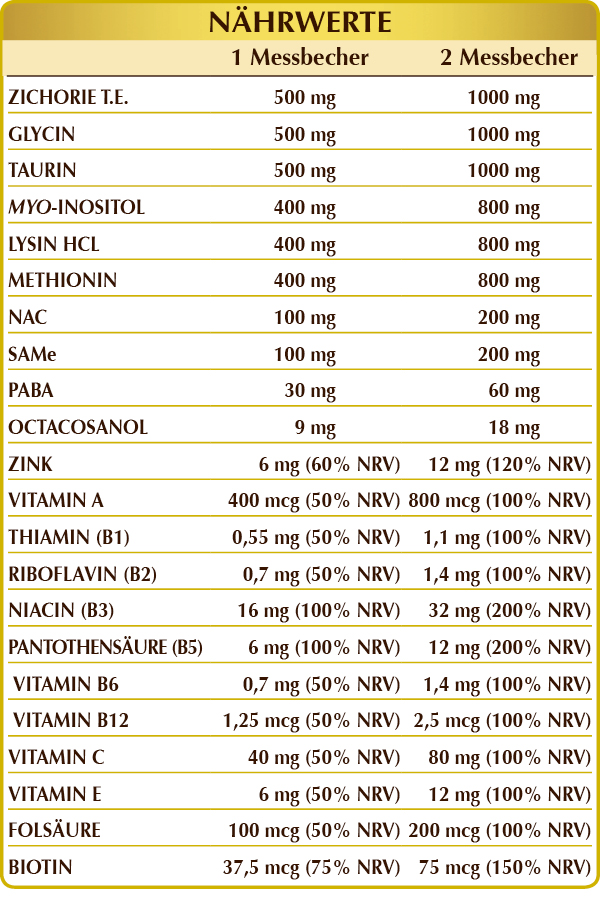 Maltodextrin aus Mais oder Reis, Zichorien (Cichorium intybus) Wurzeln T.E. (standardisiert auf 90% Inulin), Glycin, Taurin, Myo-Inositol pflanzlichen Ursprungs (aus Maissamen extrahiert), (L-)Lysin HCL oder Hydrochlorid, (L-)Methionin, SAMe (S-Adenosylmethionindisulfattosylat), NAC (N-Acetylcystein), Zinkgluconat, Vitamin C (Ascorbinsäure), PABA (p-Aminobenzoesäure), Vitamin B3 (Nicotinamid), Policosanole aus Zuckerrohr (Extrakt auf 60 % in Octacosanol titriert), Vitamin E pflanzlichen Ursprungs (D-α-Tocopherylacetat); Süßstoffe pflanzlichen Ursprungs: Steviolglycoside aus Stevia, Thaumatin; Vitamin B5 (Calciumpantothenat), Vitamin A (Retinylacetat), aktiviertes Vitamin B2 (Natrium-Riboflavin-5-phosphat), aktiviertes Vitamin B6 (Pyridoxal-5-phosphat), Vitamin B1 (Thiaminhydrochlorid), aktivierte Folsäure (Calcium-L-methylfolat), Biotin, aktiviertes Vitamin B12 (5-Desoxyadenosylcobalamin, Methylcobalamin).