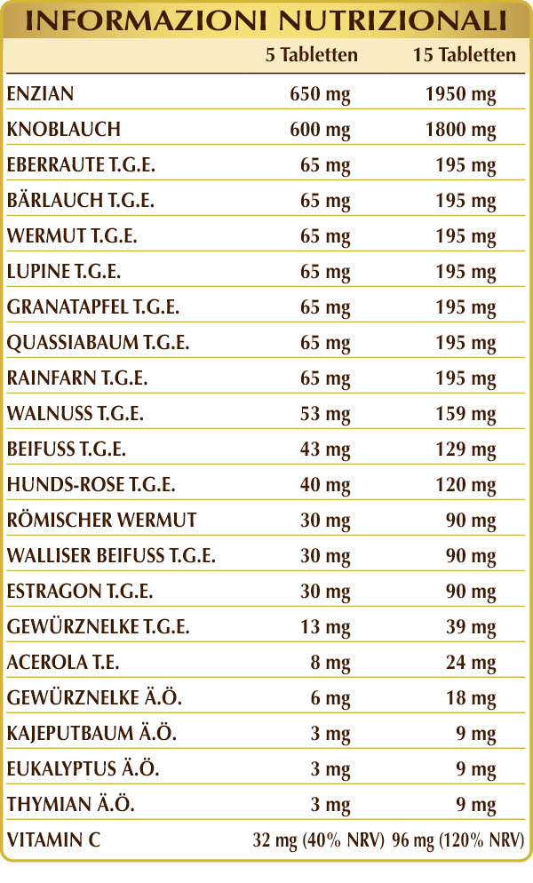T.G.E. = Trocken Gesamt Extrakt Die von uns in der Manufaktur durchgeführte Extraktion aus Pflanzen wird unter Vakuum und bei niedriger Temperatur ausgeführt, um die darin enthaltenen Wirk- und Nährstoffe (der Phytokomplex) zu bewahren; aus 4 kg Pflanzen erhalten wir durchschnittlich 1 kg Trockenextrakt (4:1). Mögliche Abweichungen in der Farbe der Tabletten zwischen verschiedenen Partien von Produkten spiegeln die natürlichen der verwendeten Pflanzen wider, sofern keine synthetischen Prinzipien vorliegen.