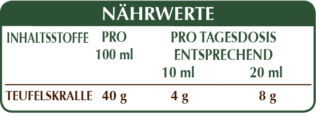 Alkoholfreie Flüssig Gesamt-Extrakt, gewonnen aus: bidestilliertes pflanzliches Glycerin, reinem Wasser, Teufelskralle (Harpagophytum procumbens) Wurzeln.