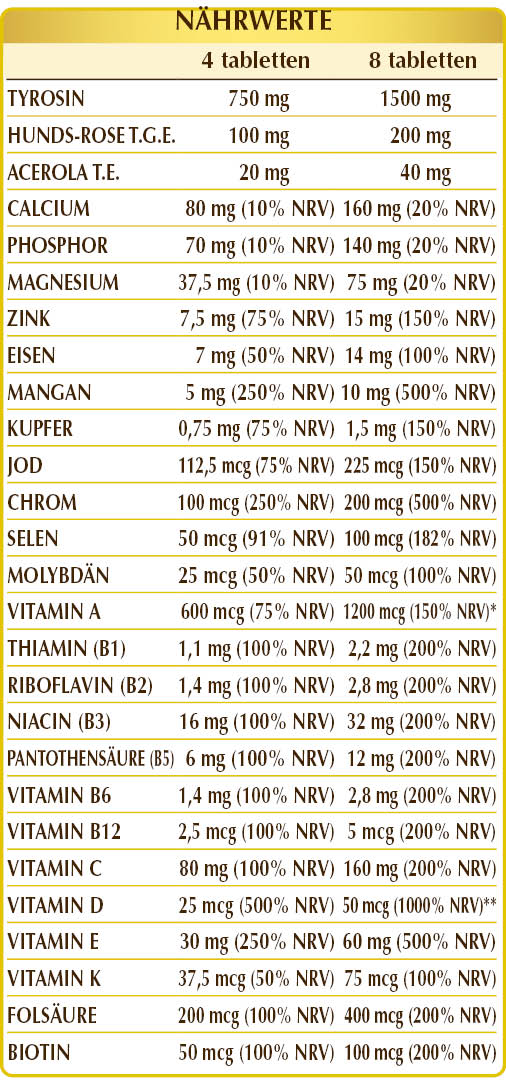 (L-)Tyrosin (aus Fermentation), Calciumphosphat-Dikalzium, mikrokristalline Cellulose°, Gummi Arabicum°, Hunds-Rose (Rosa canina) Früchte G.T.E. (titriert mit 70% Vitamin C), Pflanzliche Vitamin E (D-α-Tocopherolacetat), Siliciumdioxid°°, Zinkgluconat, Eisen-Gluconat, Magnesiumglycerophosphat, Magnesiumoxid, Mangan-Gluconat, Acerola (Malpighia glabra) FrüchteT.E. (titriert mit 50% in Vitamin C), Vitamin B3 (Nicotinamid), pflanzliches Magnesiumstearat°°, Flechte (Cladonia rangiferina) Thallus T.E. (titriert mit 50% in Vitamin D3 Cholecalciferol 100.000 IE/g), Vitamin B5 (Calciumpantothenat), Kupfergluconat, Vitamin A (Retinylacetat 500.000 IE/g), aktiviertes Vitamin B2 (Riboflavin-5-Phosphat-Natrium), aktiviertes Vitamin B6 (Pyridoxal-5-Phosphat), Vitamin B1 (Thiaminhydrochlorid), Chrompicolinat, aktivierte Folsäure (L-Methylfolat-Calcium), Kaliumiodid, Natriumselenit, Natriummolybdat, Biotin, Vitamin K1 (Phyllochinon), aktiviertes Vitamin B12 (5-Deoxyadenosylcobalamin, Methylcobalamin). °Füllstoff °°Trennmittel