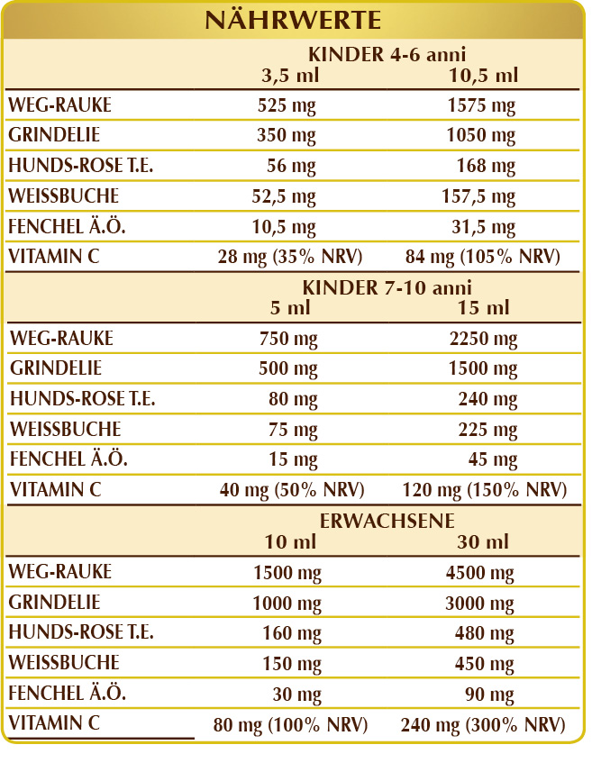 Bidestilliertes pflanzliches Glycerin, Mischblütenhonig, reines Wasser, Weg-Rauke oder Sängerkraut (Sisymbrium officinale) blühende Spitzen F.G.E., Grindelie (Grindelia robusta) Kraut mit Blüten F.G.E., Hunds-Rose(Rosa canina) Früchte G.T.E. (titriert mit 50% in Vitamin C), Weißbuche (Carpinus betulus) frische Knospen F.G.E., Fenchel (Foeniculum vulgare) Früchte Ä.Ö.; natürliche Süßstoffe: Stevioglycoside und Taumatin; Xanthan-Gum. Mit natürlichen Süßungsmitteln.