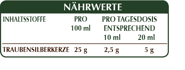 Alkoholfreie Flüssig Gesamt-Extrakt, gewonnen aus: bidestilliertes pflanzliches Glycerin, reinem Wasser, Traubensilberkerze (Actaea oder Cimicifuga racemosa) Rhizome.