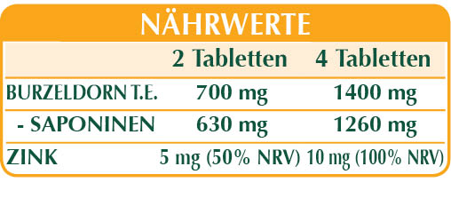 Erd-Burzeldorn hat eine tonische Wirkung, die nützlich ist um körperlicher und geistiger Müdigkeit entgegenzuwirken. Des Weiteren, fördert die Funktionalität der Harnwege. Angereichert mit Zink, nützlich, um die normale männliche Fruchtbarkeit zu erhalten und normale Testosteronspiegel im Blut zu erhalten.