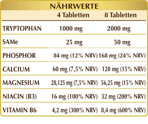 Tryptophan (aus Fermentation), zweibasisches Calciumphosphat, Magnesiumglycerophosphat, mikrokristalline Cellulose°, Gummi arabicum°, Siliciumdioxid°°, SAMe (S-Adenosylmethionindisulfat-Tosylat), Vitamin B3 (Nicotinamid), Aktiviertes Vitamin B6 (Pyridoxal-5-phosphat), Magnesiumstearat pflanzlichen Ursprungs°°.