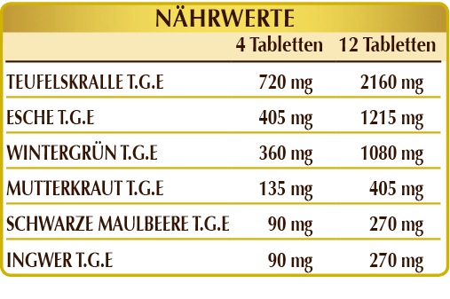 Teufelskralle (Harpagophytum procumbens) Wurzeln T.G.E., Esche (Fraxinus excelsior) Blätter T.G.E., Wintergrün (Gaultheria procumbens) Blätter T.G.E., Mutterkraut oder Fieberkraut (Tanacetum parthenium) Kraut mit Blüten T.G.E., mikrokristalline Cellulose°, Gummi Arabicum°, Schwarze Maulbeere (Morus nigra) Blätter T.G.E., Ingwer (Zingiber officinalis) Rhizome T.G.E., Siliciumdioxid°°, Magnesiumstearat Pflanzlichen Ursprungs°°. °Füllstoff °°Trennmittel
