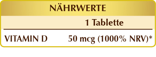 Mikrokristalline Cellulose°, Arabisches Gummi°, Dicalciumphosphat, Calciumcarbonat, Mais- oder Reismaltodextrin, Siliciumdioxid°°, Flechte (Cladonia rangiferina) Thallus D.E. (standardisiert auf Vitamin D3 Cholecalciferol 100.000 IE/g), pflanzliches Magnesiumstearat°°, pflanzliches Vitamin D2 (Ergocalciferol) (aus Zuckerrohr extrahiert). T.E.= Trockenextrakt