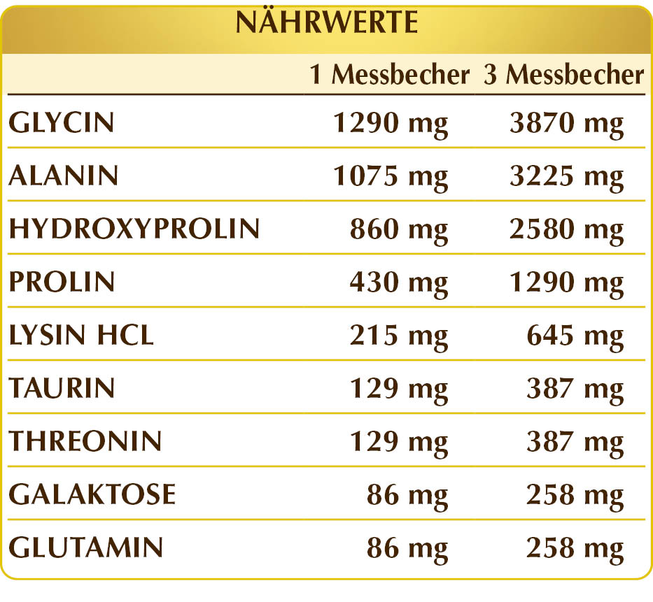 Glycin, (L-)Alanine, (L-)Hydroxyprolin, (L-)Prolin, (L-)Lysin HCL oder Chlorid, Taurin, (L-)Threonin, (D-)Galaktose pflanzlichen Ursprungs, (L-)Glutamin.
