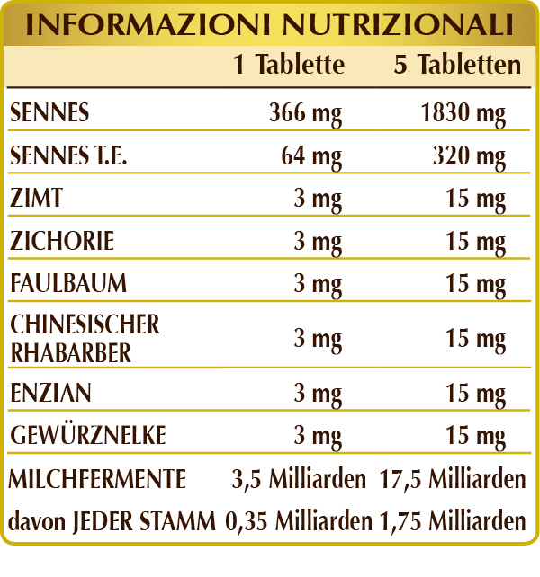Sennes, Zichorie, Faulbaum und Rhabarber fördern die regelmäßige Darmpassage. Zimt, Nelken und Enzian tragen zur Beseitigung von Darmgasen bei und fördern die Verdauungsfunktion. Des Weiteren fördern Milchfermente das Gleichgewicht der Darmbakterienflora.
