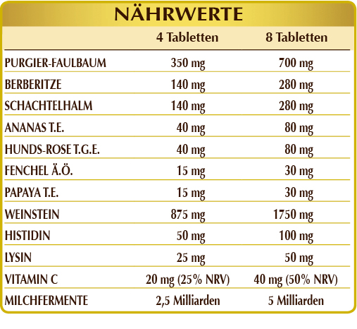 Weinstein aus gereinigtem Wein, Purgier-Faulbaum (Rhamnus purshiana) Rinde Pulv, Berberitze (Berberis vulgaris) Wurzelrinde Pulv, Schachtelhalm oder Pferdeschwanz (Equisetum arvense) Kraut Pulv, mikrokristalline Cellulose°, Gummi Arabicum°, (L-)Histidin, Ananas (Ananas sativus) Fruchtstiele T.E. (Bromelain 2500 GDU/g), Hunds-Rose (Rosa canina) Früchte T.E. (titriert mit 50% Vitamin C), (L-)Lysin HCL oder Hydrochlorid, Milchfermente (Bacillus coagulans oder Lactobacillus sporanges MTCC 25157), Siliciumdioxid°°, Papaya (Carica papaya) Früchte T.E. (Papain 30.000 U/mg), Fenchel (Foeniculum vulgare) Früchte Ä.Ö., Magnesiumstearat pflanzlichen Ursprungs°°.