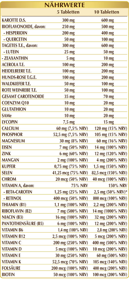 Karotte (Daucus carota) Wurzeln D.S., Tagetes (Tagetes erecta) Blütenköpfe T.E. (standardisiert auf 10 % Lutein), dibasisches Calciumphosphat, mikrokristalline Cellulose°, Gummi arabicum°, Zitrus-Hesperidin, Maltodextrin aus Mais oder Reis, Acerola (Malpighia glabra) Früchte T.E. (standardisiert auf 50% Vitamin C), Heidelbeere (Vaccinium myrtillus) Früchte T.E. (standardisiert auf 25% Anthocyanoside), Hunds-Rose (Rosa canina) Früchte G.T.E. (standardisiert auf 70% Vitamin C), Tomate (Solanum lycopersicum) Früchte T.E. (standardisiert auf 10% Lycopin), Vitamin E pflanzlichen Ursprungs (D-α-Tocopherylacetat), Eisenglukonat, Magnesiumglycerophosphat, Quercetin, Waldkiefer (Pinus sylvestris) Rinde T.E. (standardisiert auf 90% Oligomeren Proanthocyanidinen), Tagetes (Tagetes erecta) Blütenköpfe T.E. (standardisiert auf 10% Zeaxanthin), Roter Weinrebe (Vitis vinifera) Kerne T.E. (standardisiert auf 95 % oligomeren Proanthocyanidinen), Zinkgluconat, Magnesiumoxid, Siliciumdioxid°°, SAMe (S-Adenosylmethionindisulfattosylat), Mangangluconat, Vitamin B3 (Nicotinamid), Dunaliella (Dunaliella salina) Thallus (Alge) T.E. (standardisiert auf 10% Beta-Carotin), aktiviertes Vitamin B2 (Riboflavin-5-Natriumphosphat), Magnesiumstearat pflanzlichen Ursprungs°°, Coenzym Q10, reduziertes Glutathion, Calciumcarbonat, Vitamin B5 (Calciumpantothenat), Kupfersulfat, Vitamin A (Retinylacetat), aktiviertes Vitamin B6 (Pyridoxal-5-phosphat), Flechte (Cladonia rangiferina) Thallus T.E. (titriert in Vitamin D3 Cholecalciferol 100.000 IE/g), Vitamin B1 (Thiaminhydrochlorid), aktiviertes Folsäure (Calcium-L-Methylfolat), Chrompicolinat, Natriumselenit, Vitamin K1 (Phyllochinon), Biotin, aktiviertes Vitamin B12 (5-Deoxyadenosylcobalamin, Methylcobalamin). °Füllstoff °°Trennmittel
