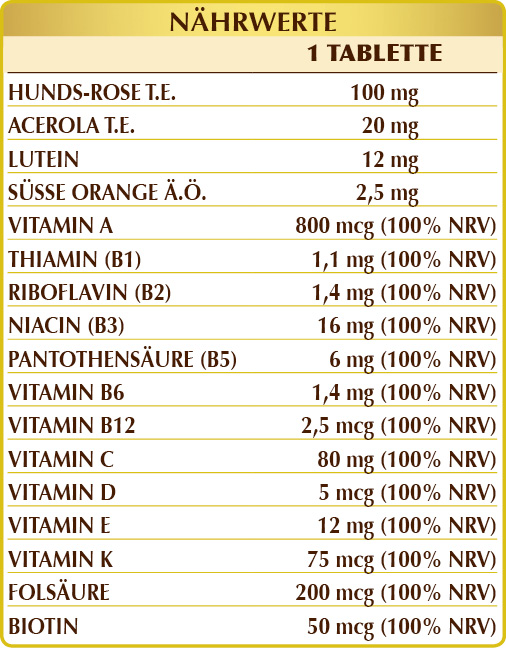 Tagetes (Tagetes erecta) Blütenköpfe T.E. (standardisiert auf 10% Lutein), Hunds-Rose (Rosa canina) Früchte G.T.E. (standardisiert auf 70% Vitamin C), Maltodextrine aus Mais oder Reis, mikrokristalline Cellulose°, Gummi Arabicum°, Vitamin E natürlicher Herkunft (D-α-Tocopherylacetat), Acerola (Malpighia glabra) Früchte T.E. (standardisiert auf 50% in Vitamin C), Vitamin B3 (Nicotinamid), Siliziumdioxid°°, Vitamin B5 (Calciumpantothenat), Vitamin A (Retinylacetat); natürliches Aroma: Süßorange (Citrus aurantium var. sinensis oder dulcis) Fruchtschalen Ä.Ö.; Magnesiumstearat pflanzlichen Ursprungs°°, aktiviertes Vitamin B2 (Natrium-Riboflavin-5-phosphat), aktiviertes Vitamin B6 (Pyridoxal-5-phosphat), Flechte (Cladonia rangiferina) Thallus T.E. (standardisiert in Vitamin D3 Cholecalciferol 100.000 IE/g), Vitamin B1 (Thiaminhydrochlorid), aktiviertes Folsäure (Calcium-L-Methylfolat), Vitamin K1 (Phyllochinon), Biotin, aktiviertes Vitamin B12 (5-Deoxyadenosylcobalamin, Methylcobalamin). °Füllstoff °°Trennmittel
