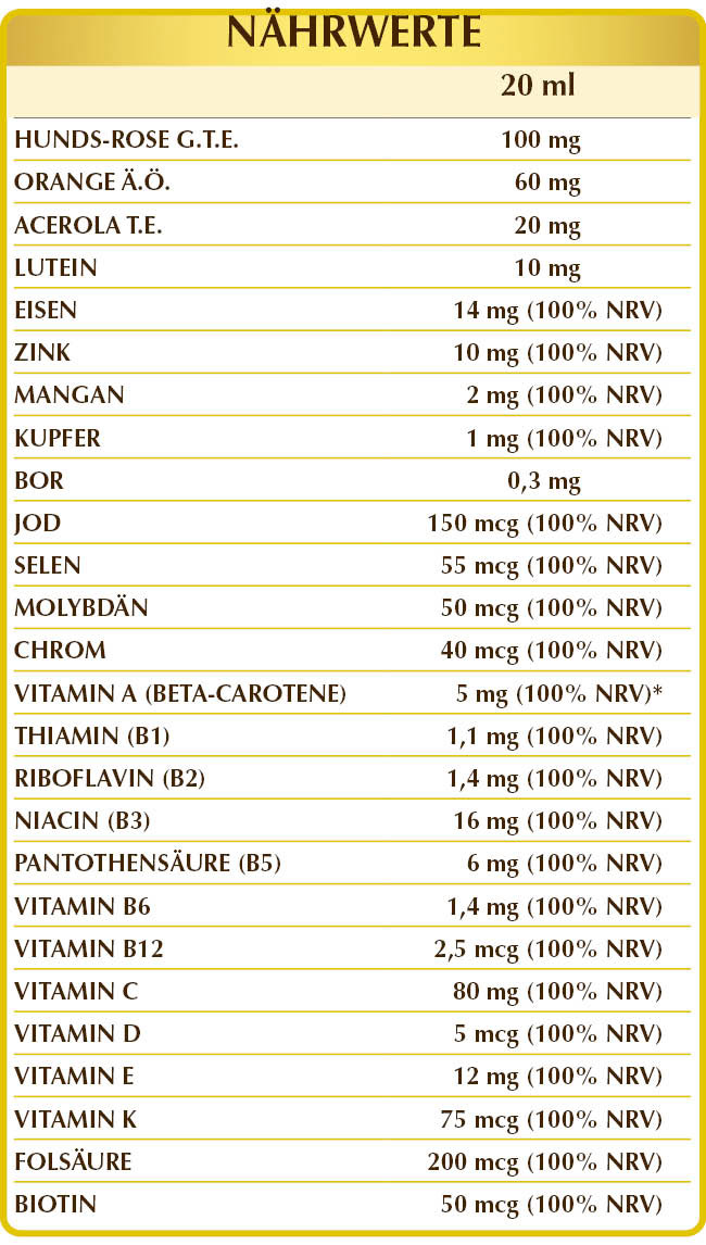 Bidestilliertes pflanzliches Glycerin, reines Wasser, Tagetes (Tagetes erecta) Blüten T.E. (standardisiert auf 5% Lutein), Eisengluconat, Hunds-Rose (Rosa canina) Früchte G.T.E. (standardisiert auf 70 % in Vitamin C), Zinkgluconat; natürliches Aroma: Süße Orange (Citrus aurantium var. sinensis oder dulcis) Fruchtschalen ätherisches Öl; Beta-Carotin (standardisiert auf 10 %), Xanthan; Vitamin E (DL-α-Tocopherylacetat), Acerola (Malpighia glabra) Früchte (standardisiert auf 50 % Vitamin C), Mangangluconat, Vitamin B3 (Nicotinamid), Kupfergluconat, Vitamin B5 (Calciumpantothenat), Natriumborat, aktiviertes Vitamin B2 (Riboflavin-5-Phosphat-Natrium), aktiviertes Vitamin B6 (Pyridoxal-5-Phosphat), Vitamin D3 (Cholecalciferol 100.000 I.E./g), Vitamin B1 (Thiaminhydrochlorid), Chrompicolinat, aktivierte Folsäure (Calcium-L-Methylfolat), Kaliumiodid, Vitamin K1 (Phyllochinon), Natriummolybdat, Natriumselenit, Biotin, aktiviertes Vitamin B12 (Methylcobalamin, 5-Desoxyadenosylcobalamin)..