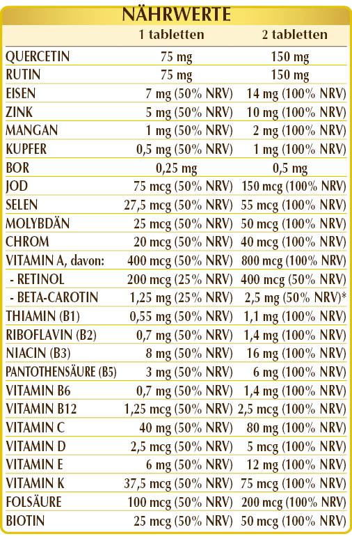 Quercetin, Rutin, mikrokristalline Cellulose°, Eisen(II)-Gluconat, Gummi Arabicum°, Zinkgluconat, Vitamin C (Ascorbinsäure), Vitamin E pflanzlichen Ursprungs (D-α-Tocopherylacetat), Dunaliella (Dunaliella salina) Thallus (Alge) T.E. (standardisiert auf 10 % Beta-Carotin), Siliciumdioxid°°, Mangan(II)-Gluconat, Vitamin B3 (Inositol-Hexanicotinat, Niacinamid), Kupfergluconat, Vitamin B5 (Calciumpantothenat), Natriumborat, Vitamin A (Retinylacetat), pflanzliches Magnesiumstearat°°, aktivierte Vitamin B2 (Riboflavin-5-Phosphat-Natrium), aktiviertes Vitamin B6 (Pyridoxal-5-Phosphat), Flechte (Cladonia rangiferina) Thallus T.E. (standardisiert auf Vitamin D3 Cholecalciferol 100.000 IE/g), Vitamin B1 (Thiaminhydrochlorid), Chrompicolinat, aktiviertes Folsäure (L-Methylfolat-Calcium), Kaliumiodid, Natriummolybdat, Natriumselenit, Vitamin K2 (Menachinon), Biotin, aktiviertes Vitamin B12 (Methylcobalamin, 5-Deoxyadenosylcobalamin). T.E.= Trockenextrakt °Füllstoff °°Trennmittel