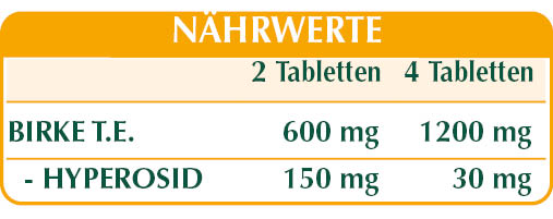 Birke (Betula Alba oder Pubescens) Blätter T.E. (standardisiert auf 2,5% Hyperoside), Maltodextrine aus Mais oder Reis, mikrokristalline Cellulose°, Gummi Arabicum°, Siliciumdioxid°°, Magnesiumstearat pflanzlichen Ursprungs°°.