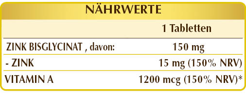 Nahrungsergänzungsmittel auf Basis von Zink in chelatischer organischer Form mit hoher Bioverfügbarkeit, angereichert mit Vitamin A. Zink schützt die Zellen vor oxidativem Stress, trägt zur normalen DNA- und Proteinsynthese bei und unterstützt den Säure-Basen-Stoffwechsel sowie den Stoffwechsel von Makronährstoffen (Kohlenhydrate und Fettsäuren). Es unterstützt zudem die kognitive Funktion, fördert das Wohlbefinden von Knochen, Nägeln und Haaren und trägt zur männlichen Fruchtbarkeit bei, indem es die normalen Testosteronspiegel im Blut aufrechterhält. In Verbindung mit Vitamin A unterstützt es die normale Funktion des Immunsystems und trägt zum normalen Erhalt von Haut und Sehkraft bei. Es ist schließlich am Prozess der Zellteilung beteiligt und unterstützt den Stoffwechsel von Vitamin A, das wiederum am Prozess der Zelldifferenzierung mitwirkt.