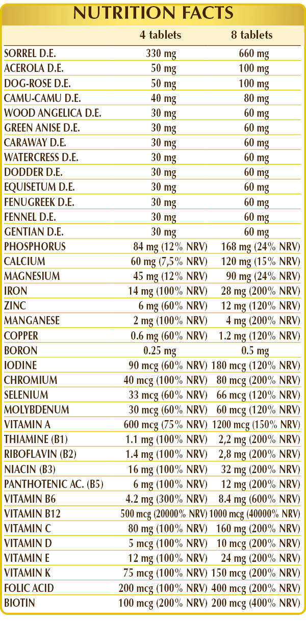 Yellow dock (Rumex crispus) root W. D.E., dibasic calcium phosphate, magnesium glycerophosphate, microcrystalline cellulose°, gum arabic°, ferric ammonium citrate, acerola (Malpighia glabra) fruit D.E. (standardized to 50% vitamin C), dog rose (Rosa canina) fruit W.D.E. (standardized to 70% vitamin C), zinc gluconate, camu-camu (Myrciaria dubia) fruit D.E. (standardized to 50% vitamin C), silicon dioxide°°, wood angelica (Angelica sylvestris) root W.D.E., green anise (Pimpinella anisum) fruit W.D.E., caraway or meadow cumin (Carum carvi) fruit W.D.E., watercress (Nasturtium officinale) herb W.D.E., dodder (Cuscuta epithymum) herb W.D.E., equisetum or horsetail (Equisetum arvense) herb W.D.E., fenugreek (Trigonella foenum-graecum) seed W.D.E., fennel (Foeniculum vulgare) fruit W.D.E., gentian (Gentiana lutea) root W.D.E., magnesium oxide, natural-source vitamin E (D-α-tocopherol acetate), manganese gluconate, vitamin B3 (nicotinamide), plant-based magnesium stearate°°, vitamin B5 (calcium pantothenate), activated vitamin B6 (pyridoxal-5-phosphate), sodium borate, copper gluconate, vitamin A (retinyl acetate), activated vitamin B2 (riboflavin 5-sodium phosphate), lichen Cladonia rangiferina) thallus D.E. (standardized to vitamin D3 cholecalciferol 100,000 IU / g), vitamin B1 (pyridoxine hydrochloride), activated vitamin B2 (5-deoxyadenosylcobalamin, methylcobalamin), chromium picolinate, activated folic acid (calcium L-methylfolate), potassium iodide, biotine, sodium molybdate, vitamin K1 (phylloquinone), sodium selenite.