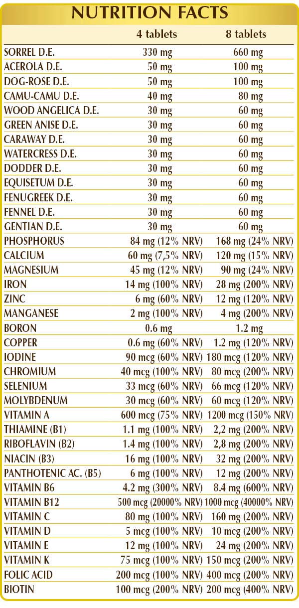 Yellow dock (Rumex crispus) root W. D.E., dibasic calcium phosphate, magnesium glycerophosphate, microcrystalline cellulose°, gum arabic°, ferric ammonium citrate, acerola (Malpighia glabra) fruit D.E. (titrated to 50% vitamin C), dog rose (Rosa canina) fruit W.D.E. (titrated to 70% vitamin C), zinc gluconate, camu-camu (Myrciaria dubia) fruit D.E. (titrated to 50% vitamin C), silicon dioxide°°, wood angelica (Angelica sylvestris) root W.D.E., green anise (Pimpinella anisum) fruit W.D.E., caraway or meadow cumin (Carum carvi) fruit W.D.E., watercress (Nasturtium officinale) herb W.D.E., dodder (Cuscuta epithymum) herb W.D.E., equisetum or horsetail (Equisetum arvense) herb W.D.E., fenugreek (Trigonella foenum-graecum) seed W.D.E., fennel (Foeniculum vulgare) fruit W.D.E., gentian (Gentiana lutea) root W.D.E., magnesium oxide, natural-source vitamin E (D-α-tocopherol acetate), manganese gluconate, vitamin B3 (nicotinamide), plant-based magnesium stearate°°, vitamin B5 (calcium pantothenate), activated vitamin B6 (pyridoxal-5-phosphate), sodium borate, copper gluconate, vitamin A (retinyl acetate), activated vitamin B2 (riboflavin 5-sodium phosphate), lichen Cladonia rangiferina) thallus D.E. (titrated to vitamin D3 cholecalciferol 100,000 IU / g), vitamin B1 (pyridoxine hydrochloride), activated vitamin B2 (5-deoxyadenosylcobalamin, methylcobalamin), chromium picolinate, activated folic acid (calcium L-methylfolate), potassium iodide, biotine, sodium molybdate, vitamin K1 (phylloquinone), sodium selenite. °Bulking agent °°Anti-caking agent