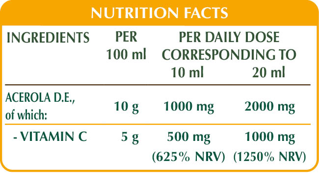 Acerola has a tonic and energising action, is naturally rich in vitamin C, which has many properties: it promotes energy metabolism, reducing tiredness and fatigue; protects cells from oxidative stress and regenerates the reduced form of vitamin E; contributes to a normally functioning immune system, nervous system and psychological function, in addition it promotes collagen production while helping maintain healthy blood vessels, bones, cartilage, skin, teeth and gums; it finally increases iron absorption.