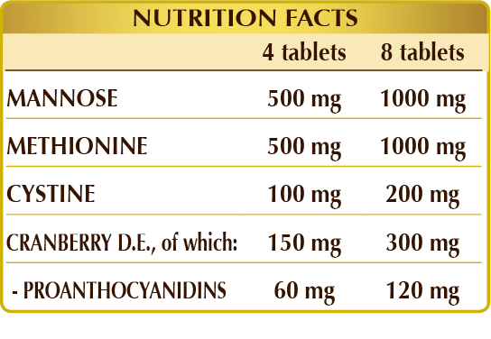Supplement of mannose, amino acids (methionine and cystine) and American cranberry extract. The latter promotes the drainage of body fluids and the urinary tract function and has beneficial antioxidant action.