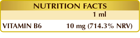 Bi-distilled vegetable glycerine, pure water, vitamin B6 (pyridoxal-5-phosphate).