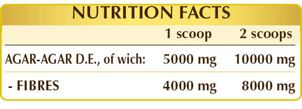 Agar-agar is a soluble fibre that cannot be digested nor absorbed by the gut; it normalises stool volume and consistency, supporting regular bowel movements.