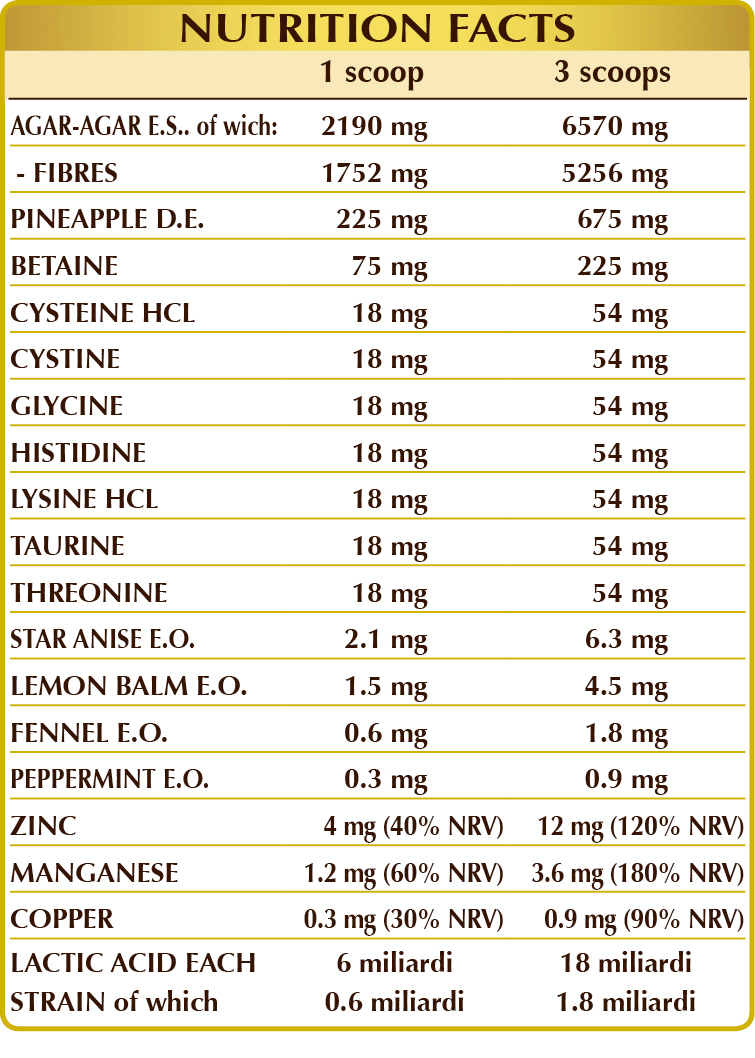 Agar-agar (Gelidium amansii) thallus (seaweed) D.E., corn or rice-derived maltodextrins, pineapple (Ananas comosus) fruit stem D.E. (bromelain 2500 GDU / g), betaine HCL or hydrochloride, blend of lactic acid bacteria (standardized with 10% in each of the following strains: Bifidobacterium bifidum SD5215, breve SD5206, lactis SD5219; Lactobacillus acidophilus SD5212, brevis SD5214, bulgaricus SD5589, casei SD5213, paracasei SD5275, plantarum SD5209, rhamnosus SD5217), zinc gluconate, (L-)cysteine HCL or hydrochloride, (L-)cystine, glycine, (L-)histidine, (L-)lysine HCL or hydrochloride, taurine, (L-)threonine, manganese gluconate, copper gluconate, star anise (Illicium verum) fruit E.O., lemon balm (Melissa officinalis) leaf E.O., natural sweeteners: steviol glycosides and thaumatin; fennel (Foeniculum vulgare) fruit E.O., peppermint (Mentha piperita) leaf E.O.