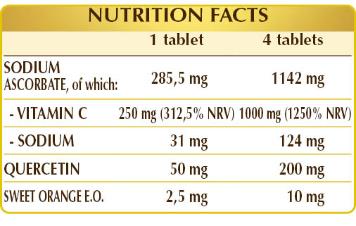 Vitamin C supplement, in non-acidic ascorbate form, enriched with the bioflavonoid quercetin. Vitamin C promotes energy metabolism, reducing tiredness and fatigue; it protects cells from oxidative stress and regenerates the reduced form of vitamin E; it contributes to the normal function of the immune system, the nervous system, and psychological function; it promotes collagen formation, helping to maintain the normal functions of blood vessels, bones, cartilage, skin, teeth, and gums; it increases iron absorption.