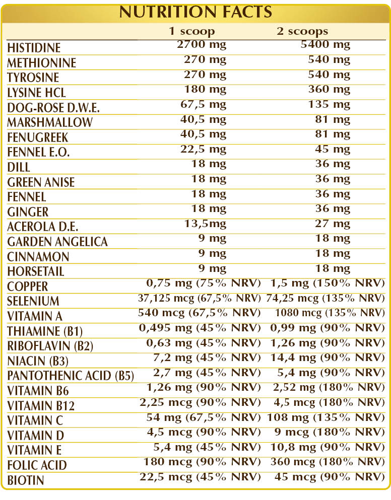(L-)histidine, corn or rice-based maltodextrins, (L-)methionine, (L-)tyrosine, (L-)lysine HCL or hydrochloride, dog-rose (Rosa canina) fruit D.E. (standardized 70% vitamin C), marshmallow (Althaea officinalis) root Pulv, fenugreek (Trigonella foenum-graecum) seed Pulv, fennel (Foeniculum vulgare) fruit E.O., dill (Anethum graveolens) fruit Pulv, green anise (Pimpinella anisum) fruit Pulv, fennel (Foeniculum vulgare) fruit Pulv, ginger (Zingiber officinalis) rhizome Pulv, plant-derived vitamin E (D--tocopheryl acetate), acerola (Malpighia glabra) fruit D.E. (standardized to 50% in vitamin C), plant-derived vitamin E (D-α-tocopheryl acetate); natural origin sweeteners: steviol glycosides from stevia, thaumatin; garden angelica (Angelica archangelica) root Pulv., cinnamon (Cinnamomum zeylanicum) bark powder, horsetail (Equisetum arvense) herb powder, vitamin B3 (nicotinamide), vitamin A (retinyl acetate), copper sulfate, vitamin B5 (calcium pantothenate), activated vitamin B6 (pyridoxal-5-phosphate), vitamin D3 (cholecalciferol 100,000 IU/g), activated vitamin B2 (riboflavin 5’-phosphate sodium), vitamin B1 (thiamine hydrochloride), activated folic acid (L-methylfolate calcium), sodium selenite, biotin, activated vitamin B12 (5-deoxyadenosylcobalamin, methylcobalamin). Pulv. = Powder Sweetened only with natural sweeteners.