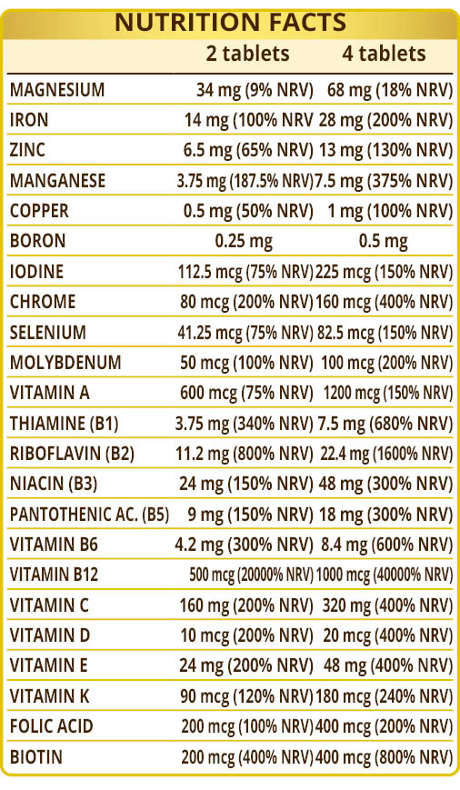 Vitamin C (ascorbic acid), dibasic calcium phosphate, microcrystalline cellulose°, gum arabic°, ferric ammonium citrate, zinc gluconate, plant-based vitamin E (D-α-tocopheryl acetate), magnesium oxide, dibasic magnesium citrate, manganese gluconate, vitamin B3 (niacinamide), silicon dioxide°°, sodium borate, activated vitamin B2 (riboflavin 5-phosphate sodium), plant-based magnesium stearate°°, vitamin B5 (calcium pantothenate), activated vitamin B6 (pyridoxal-5-phosphate), vitamin B1 (thiamine hydrochloride), lichen (Cladonia rangiferina) thallus D.E. (standardized to vitamin D3 cholecalciferol 100,000 IU / g), Vitamin A (retinyl acetate), copper gluconate, sodium borate, chromium picolinate, activated vitamin B12 (5-deoxyadenosylcobalamin, methylcobalamin), activated folic acid (L-methylfolate calcium), biotin, potassium iodide, sodium molybdate, sodium selenite, vitamin K1 (phylloquinone). D.E.= Dehydrated Extract °Bulking agent °°Anti-caking agent