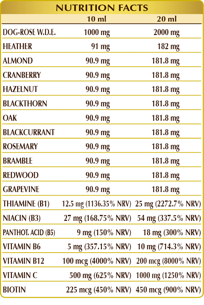 Food supplement made from glycerine macerate of fresh meristematic tissues, high in vitamins that all contribute to normal energy metabolism. In particular, vitamins B6, B12, and C support normal function of the immune system, and, along with vitamins B3 and B5, reduce tiredness and fatigue. Vitamins B1, B3, B6, B12 and biotin contribute to a healthy and normally functioning nervous system and maintain normal psychological function. Furthermore, biotin contributes to the maintenance of hair health, while vitamin C protects cells from oxidative stress and promotes collagen formation, helping to maintain the normal functions of blood vessels, bones, cartilage, skin, teeth, and gums.