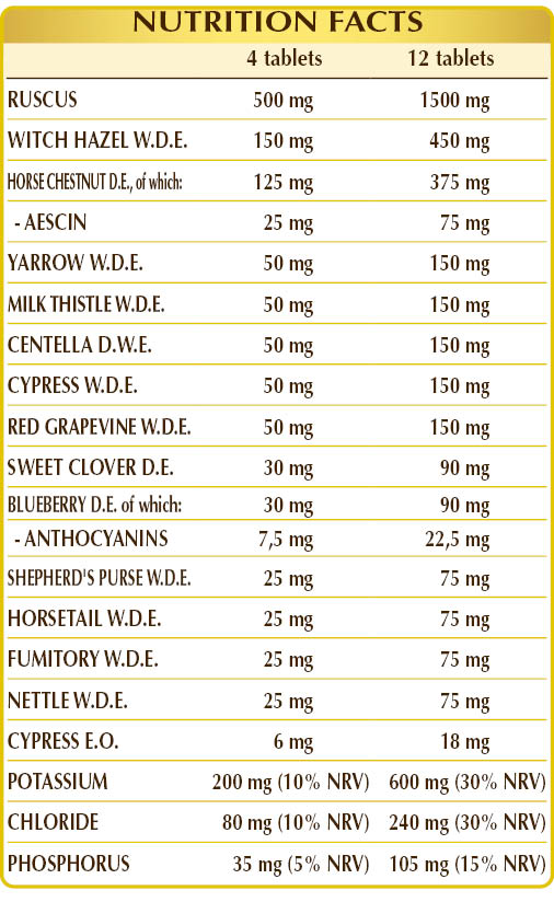 Butcher's broom (Ruscus aculeatus) root powder, potassium phosphate dibasic, potassium chloride, witch hazel (Hamamelis virginiana) leaf D.W.E., microcrystalline cellulose°, gum arabic°, horse chestnut (Aesculus hippocastanum) seed D.E. (standardized to 20% aescin), potassium citrate, yarrow (Achillea millefolium) flowering herb D.W.E., milk thistle (Silybum marianum) leaf D.W.E., Asian coinleaf (Centella asiatica) herb D.W.E., cypress (Cupressus sempervirens) cone (fruit) D.W.E., red vine (Vitis vinifera) leaf D.W.E., sweet clover (Melilotus officinalis) flowering herb D.W.E. (standardized to 20% coumarin ), blueberry (Vaccinium myrtillus) fruit D.E. (standardized to 25% in anthocyanosides), shepherd's purse (Capsella bursa-pastoris) herb D.W.E., equisetum or horsetail (Equisetum arvense) herb D.W.E., fumitory (Fumaria officinalis) flowering herb D.W.E., nettle (Urtica dioica) leaf D.W.E., silicon dioxide°°, cypress (Cupressus sempervirens) cone (fruit) E.O., plant-source magnesium stearate°°.