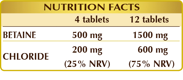 Chloride and betaine supplement. Chloride promotes digestive function through normal production of hydrochloric acid in the stomach whereas betaine contributes to normal homocysteine metabolism*.