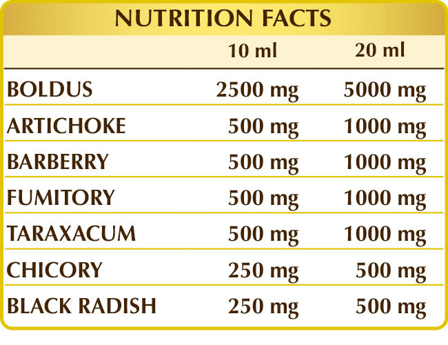 Bidistilled vegetable glycerine, pure water, boldo (Peumus boldus) leaf W.L.E., artichoke (Cynara scolymus) leaf W.L.E., barberry (Berberis vulgaris) root bark W.L.E., fumitory (Fumaria officinalis) flowering herb W.L.E., dandelion (Taraxacum officinale) root W.L.E., chicory (Cichorium intybus) root W.L.E., black radish (Raphanus sativus var. niger) root W.L.E..