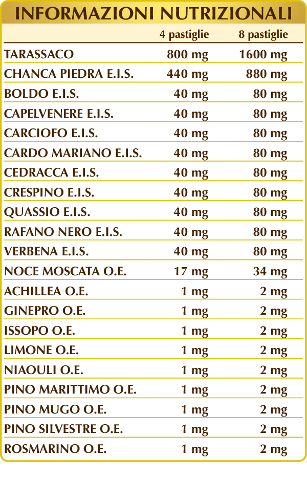Dandelion (Taraxacum officinale) leaf powder, cmicrocrystalline cellulose°, gum arabic°, Chanca piedra, or phyllanthus (Phyllanthus niruri) herb W.D.E., boldo (Peumus boldus) leaf W.D.E., maidenhair fern (Adiantum capillus-veneris) herb W.D.E., artichoke (Cynara scolymus) leaf W.D.E., milk thistle (Silybum marianum) herb W.D.E., ceterach or break-stone (Ceterach officinarum) leaf W.D.E., barberry (Berberis vulgaris) root bark W.D.E., bitter-ash (Quassia amara) wood W.D.E., black radish (Raphanus sativus var. niger) root W.D.E., vervain (Verbena officinalis) flowering herb W.D.E., silicon dioxide°°, plant-based magnesium stearate°°, nutmeg (Myristica fragrans) fruit (kernel) E.O., yarrow (Achillea millefolium) flowering herb E.O., juniper (Juniperus communis) cone (fruit) E.O., hyssop (Hyssopus officinalis) leaf E.O., lemon (Citrus limon) fruit peel E.O., niaouli (Melaleuca viridiflora) leaf E.O., maritime pine (Pinus pinaster) needle (leaf) E.O., dwarf pine (Pinus mugo, montana or pumilio) needle (leaf) E.O., Scots pine (Pinus sylvestris) needle (leaf) E.O., rosemary (Rosmarinus officinalis) flowering top E.O.