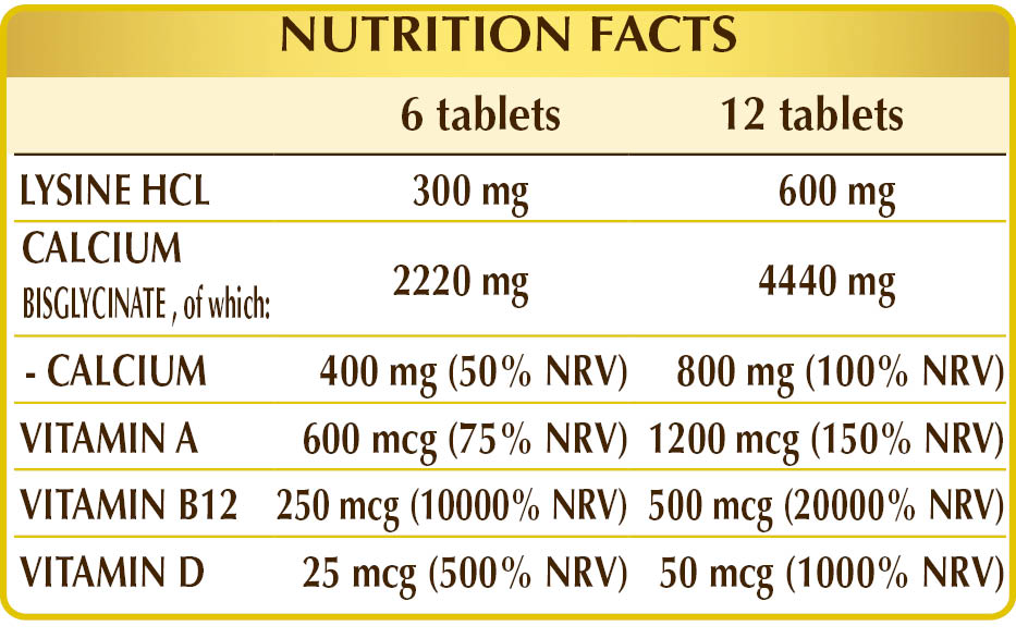 Calcium bisglycinate, (L-)lysine HCL or hydrochloride, gum arabic°, microcrystalline cellulose°, vegetable-derived magnesium stearate°°, lichen (Cladonia rangiferina) thallus D.E. (standardized in vitamin D3 as cholecalciferol 100,000 IU/g), vitamin A (retinyl acetate 500,000 IU/g), activated vitamin B12 (5-deoxyadenosylcobalamin, methylcobalamin).